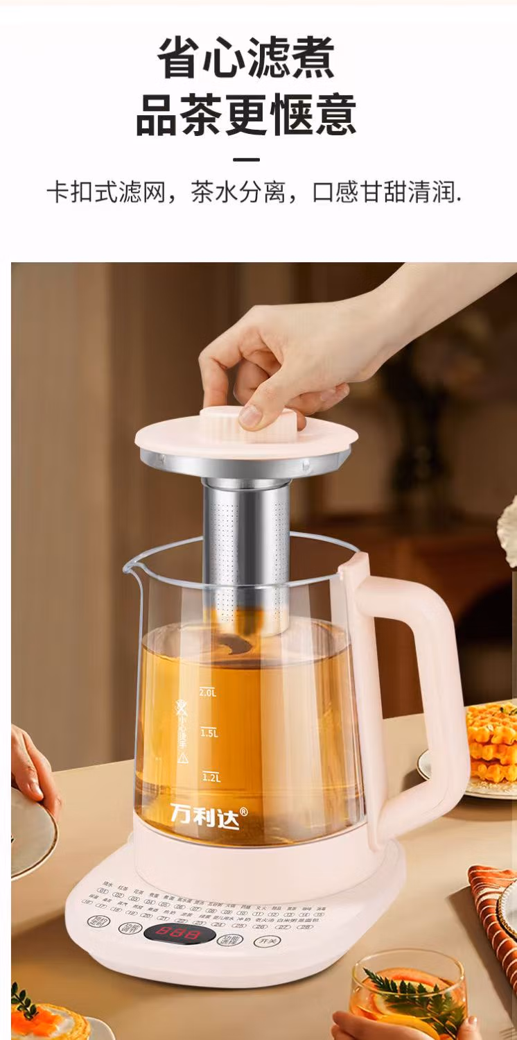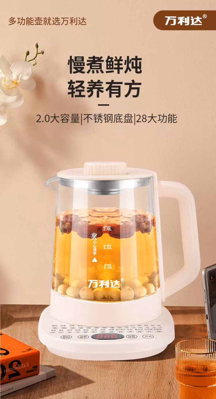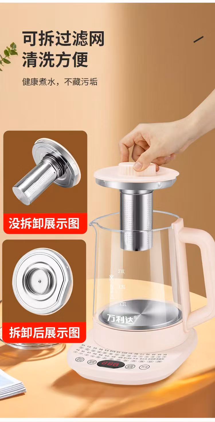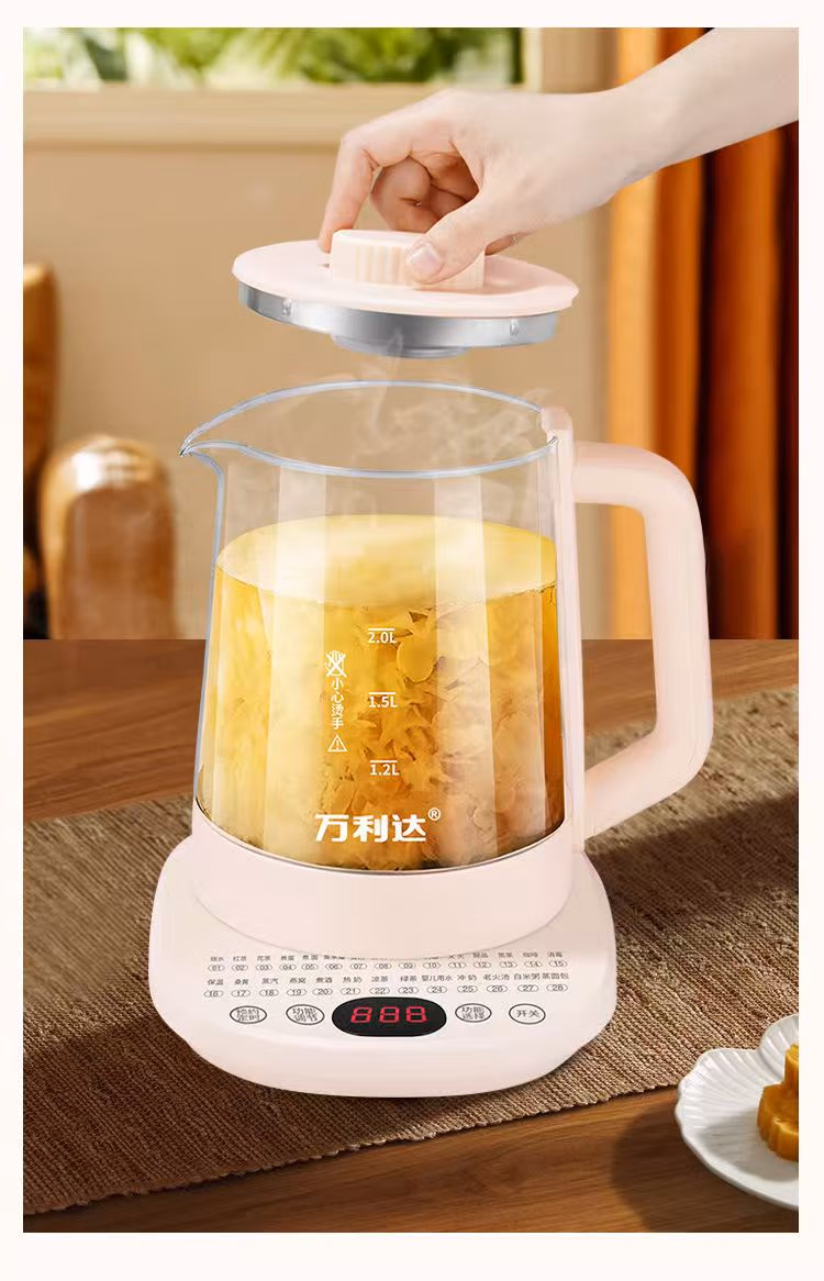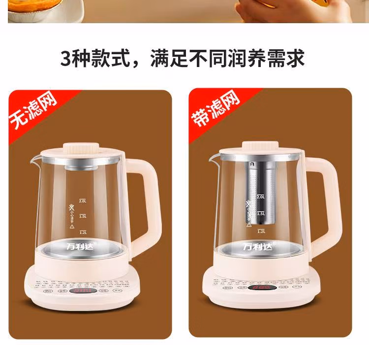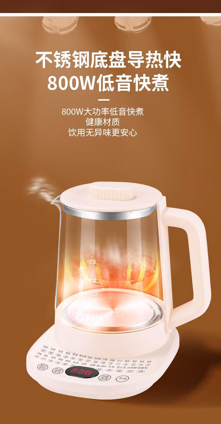 万利达电热水壶烧水壶家用耐用恒温养生壶加厚玻璃自动断电花茶壶食品级 杏色【加厚玻璃】智能恒温 2L